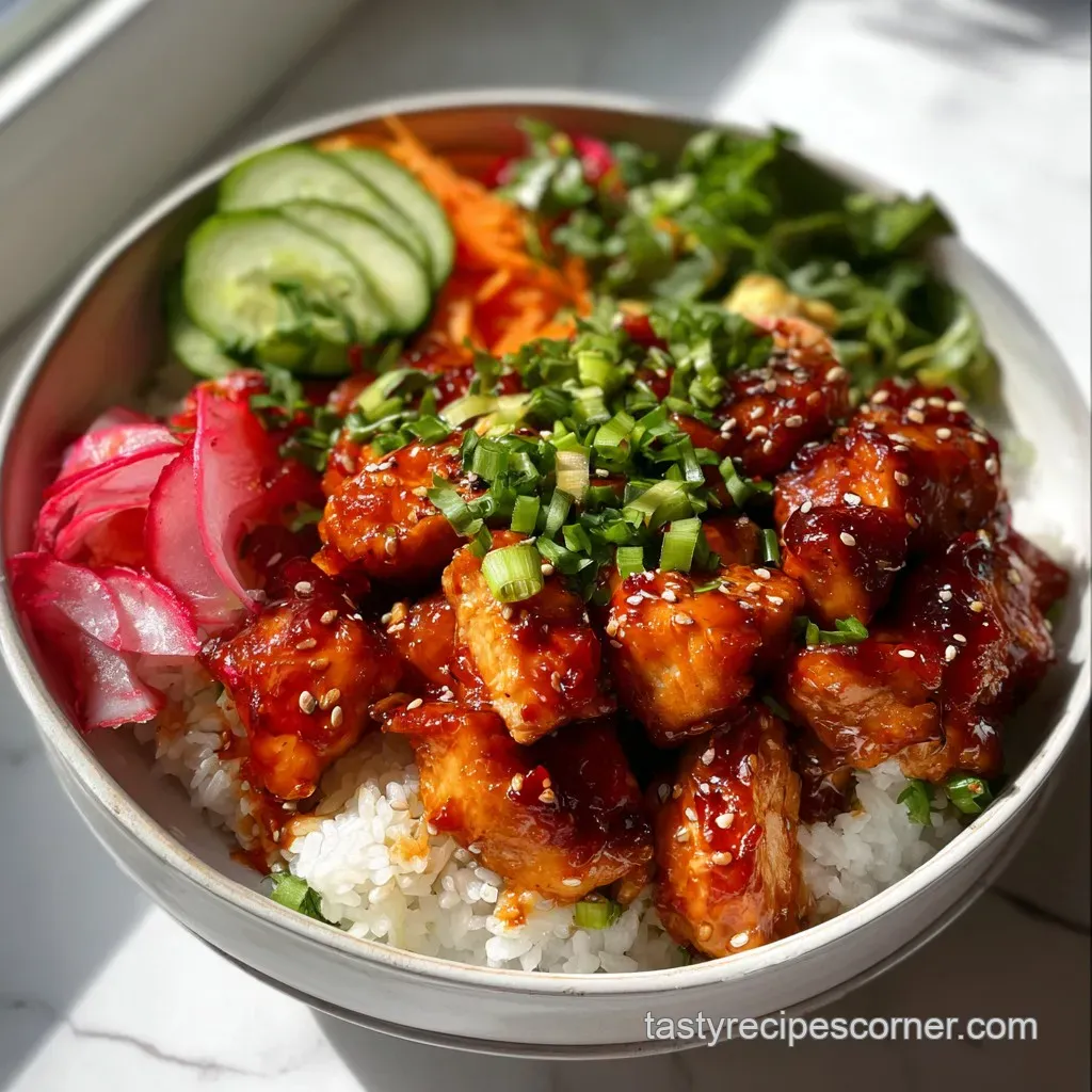 We're not just throwing ingredients in a bowl; we’re intentionally building contrasts. You have the hot, sticky, savory chicken against the cool, tangy crunch of the quick pickles, all anchored by a foundational base of perfectly fluffy rice. It's a seriously gourmet rice bowl experience.