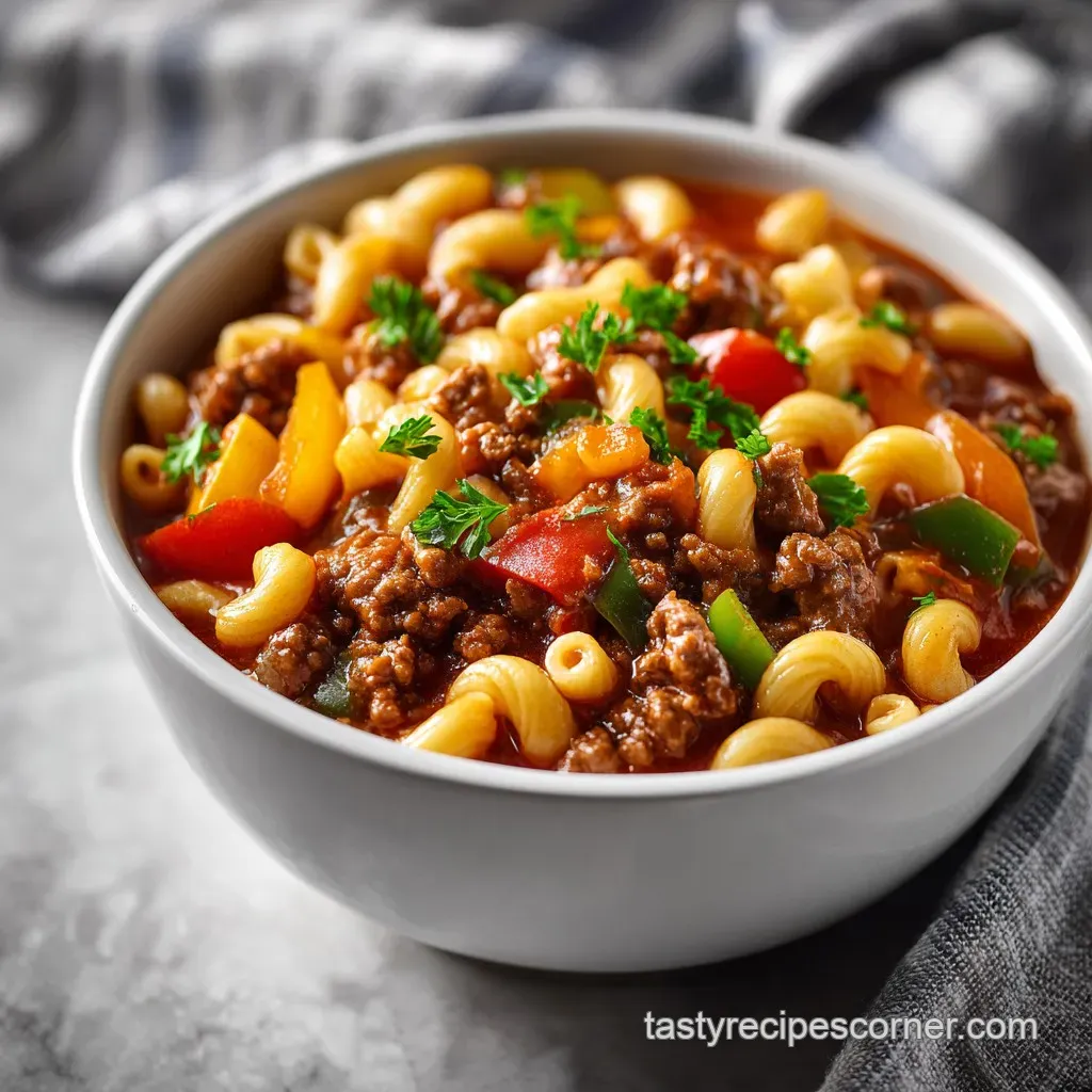 It is a one-pot meal consisting of meat, aromatics, and a tomato based sauce. The American version specifically integrates pasta directly into the sauce so the noodles absorb the beef broth and seasonings while cooking.